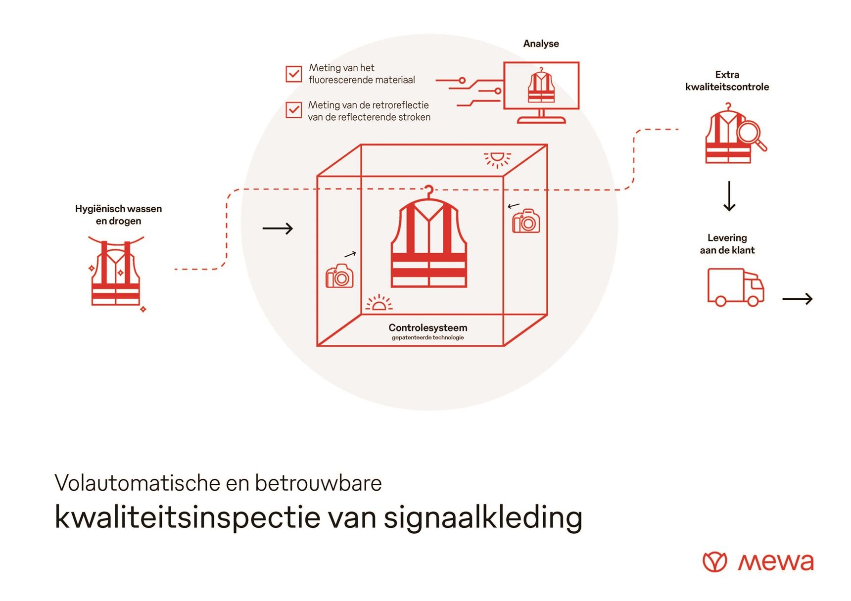 In een volledig geautomatiseerd inspectieproces wordt de kleding na het wassen en drogen via een transportsysteem door het testsysteem getransporteerd, hangend op kleerhangers. Daar wordt zowel de luminantiefactor van de fluorescerende stof als de specifieke reflectiewaarde van de retroreflecterende strips geregistreerd en gedocumenteerd. Als de software detecteert dat een stuk kleefstof buiten de standaardwaarden valt, wordt het automatisch gescheiden en onderworpen aan een verder inspectieproces. "De AI-ondersteunde technologie is een aanvulling op de eerdere visuele inspectie en garandeert onze klanten nog meer veiligheid. Tegen eind 2025 zullen we deze digitale inspecties in alle Mewa vestigingen kunnen uitvoeren," legt Stefan Abel, Hoofd Kwaliteit Productie & Logistiek bij Mewa, uit. De resultaten worden automatisch gedocumenteerd en kunnen indien nodig ook beschikbaar worden gesteld aan klanten, bijvoorbeeld bij een audit.